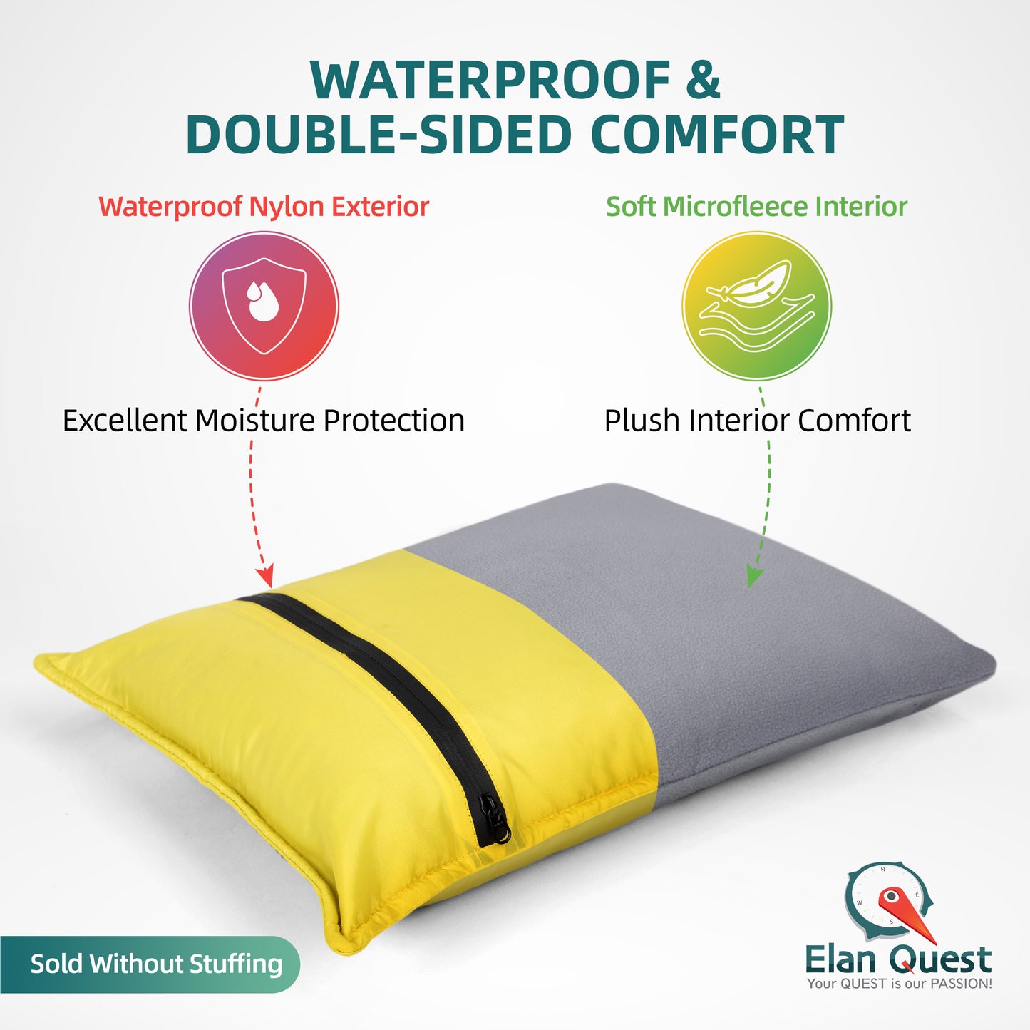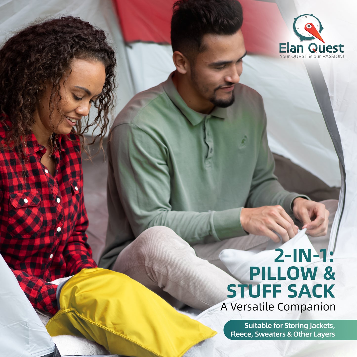 Tired of small travel pillows that are lumpy and uncomfortable; too flat to support your head; makes crunching, crackling noises that interrupt your sleep? This travel and camping pillow is COMFORTABLE, made of QUIET snugly soft material , is easily CUSTOMIZABLE, dual functioning stuff sack and pillow. This means CONVENIENCE, SUPPORT and the QUALITY SLEEP you need on those long trips. No more bulky pillows dangling from your hand luggage; or neck pillow too tight around your neck. The reversible stuff sack camp pillow is COMPACT, LIGHTWEIGHT, easily folded and packed away in your carry-on luggage or coat pocket. Whether on an airplane, train, bus or car, like most travelers, you are faced with grabbing sleep when or where you can. You control the loft and firmness of our Elan Quest backpacking pillow to create exact camping pillows for sleeping and lumbar support you need for restful sleep.FEATURES and SPECIFICATIONS